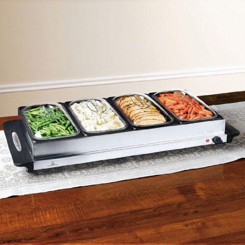 Buffet Servers Keep Food Hot And Delicious. Elegant stainless buffet servers have a warming tray base to make entertaining easy. Both with a see-thru high-dome plastic lid. Adjustable thermostat keeps food at the perfect temperature. 4-Section Buffet Server. Our elegant quadruple buffet server has a warming tray base plus 2.5qt. stainless steel pans, each with a see-thru high-dome plastic lid. Adj